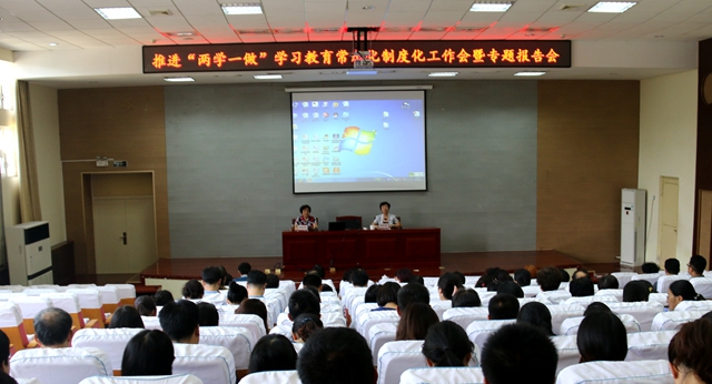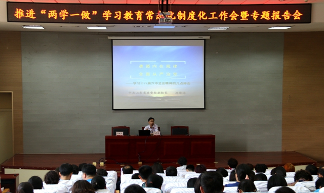 6月8日下午,学校在图书馆一楼报告厅召开推进“两学一做”学习教育常态化制度化工作会暨专题报告会,对推进“两学一做”学习教育常态化制度化作出部署安排。学校领导班子全体成员出席会议。党委书记郭翠芬讲话,党委副书记宿建沛主持会议。山东省委党校副校长孙黎海受邀作专题报告。学校科级以上党员干部、党支部书记参加会议。
