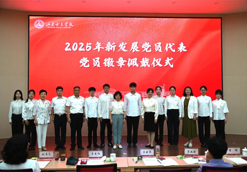 学校领导为2025年新发展党员代表佩戴党员徽章。